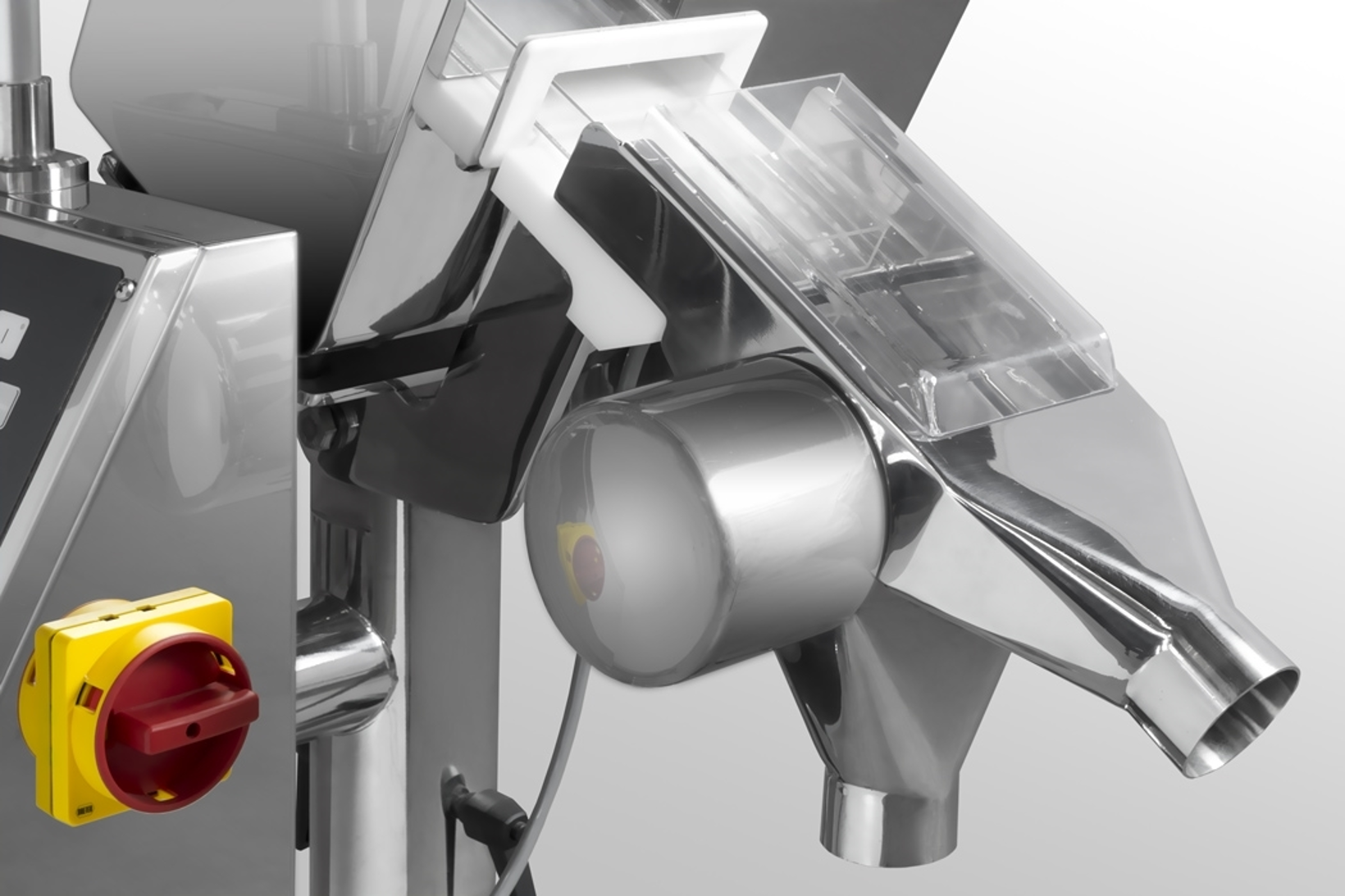 The machine consists of a tilted chute that goes through the metal detector coil. Upon detecting metal contaminants, a flap is activated, which diverts the contaminant out of the production flow. The transit aperture is made with inert materials that ensure the coil is completely sealed. It is easily removable and can be sanitized completely. It is available with two different transit dimensions: 95x22mm and 95x32mm. The control panel, with IP54, is on-board and the entire main support structure is made of stainless steel with a ballasted base to increase insensitivity to external vibrations and guarantee high-level mechanical stability to the unit. The structure allows you to adjust product infeed height (from 850 to 1000 mm), tilt angle (from 0° to 45°), and unit movement via locking wheels. The machine is available with or without a rejection bin.